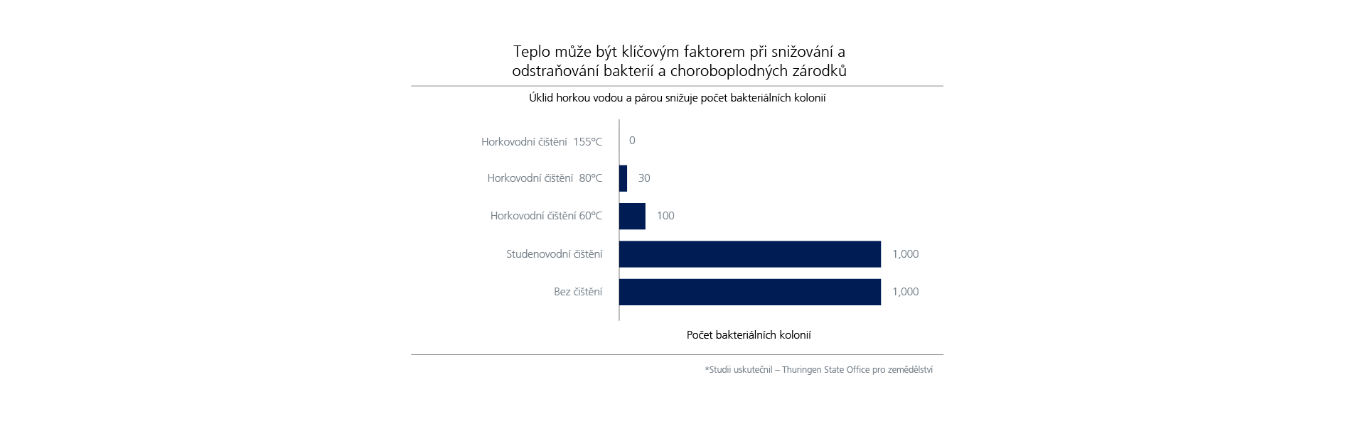 Vysoká teplota je klíčovým faktorem v boji proti bakteriím. Studie Úřadu pro zemědělství v Durynsku zjistila, že při úklidu studenou vodou nedošlo k ovlivnění počtu bakterií, avšak zvýšení teploty na 60 °C snížilo počet bakteriálních kolonií o 90 %. Při 80 °C došlo k redukci bakteriálních kolonií o 97 % a při 155 °C byly zcela eliminovány.