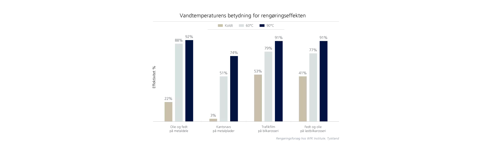 I samarbejde med wfk – Cleaning Technology Institute gennemførte vi tests, der sammenlignede højtryksrensning med koldt og varmt vand, og fandt ud af, at varmt vand reducerede rengøringstiden med gennemsnitligt 40 % på tværs af alle anvendelsesområder. I nogle tilfælde, f.eks. hvor der var fedt og olie til stede, var rengøring med varmt vand fire gange mere effektiv end rengøring med koldt vand. Det svarer til en reduktion af rengøringstiden på 75 %.