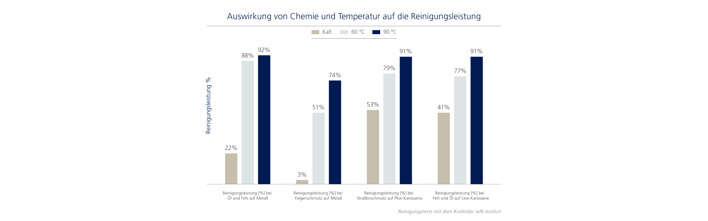 In Zusammenarbeit mit dem wfk - Cleaning Technology Institute haben wir Tests zum Vergleich von Heißwasser- und Kaltwasser-Hochdruckreinigung durchgeführt und festgestellt, dass Heißwasser die Reinigungszeiten bei allen Anwendungen um durchschnittlich 40 % verkürzt. In einigen Fällen, z. B. bei Fetten und Ölen, war die Heißwasserreinigung viermal effizienter als die Kaltwasserreinigung. Dies entspricht einer Reduzierung der Reinigungszeit um 75 %.