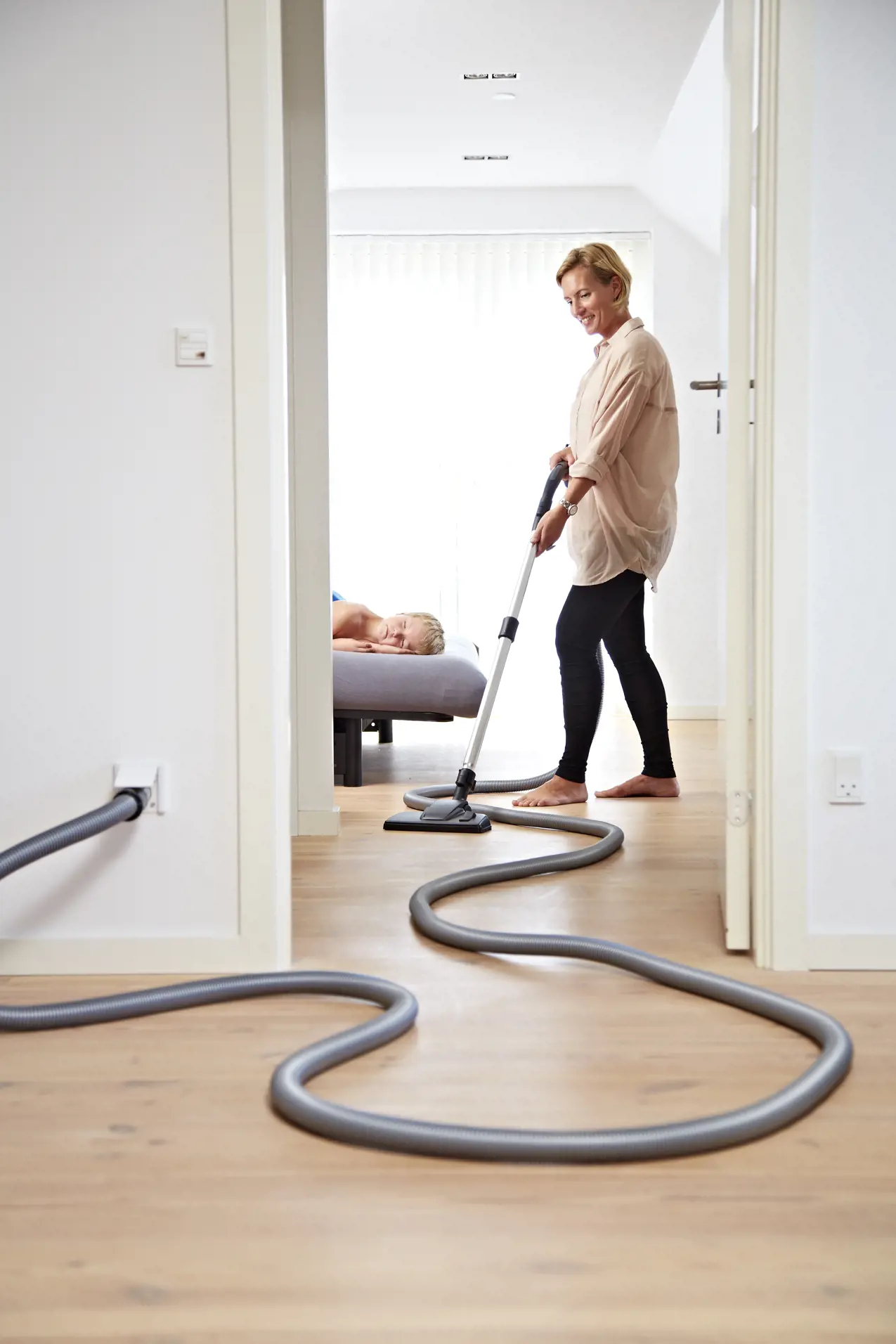 A central vacuum cleaner does just that. It is extremely quiet, odour free, lightweight and handy, turning a repetitive domestic chore into an agreeable easy-to-do job. With the central power unit (combined motor and dust container) stowed away on the loft, in the basement, or in some remote location where it bothers no one, it is out of the way, and the only thing you need to carry around when vacuuming is the hose itself. A clever precaution against asthma, eczema and other allergies as all dust pick up is directed out of the rooms through the sealed tubes.